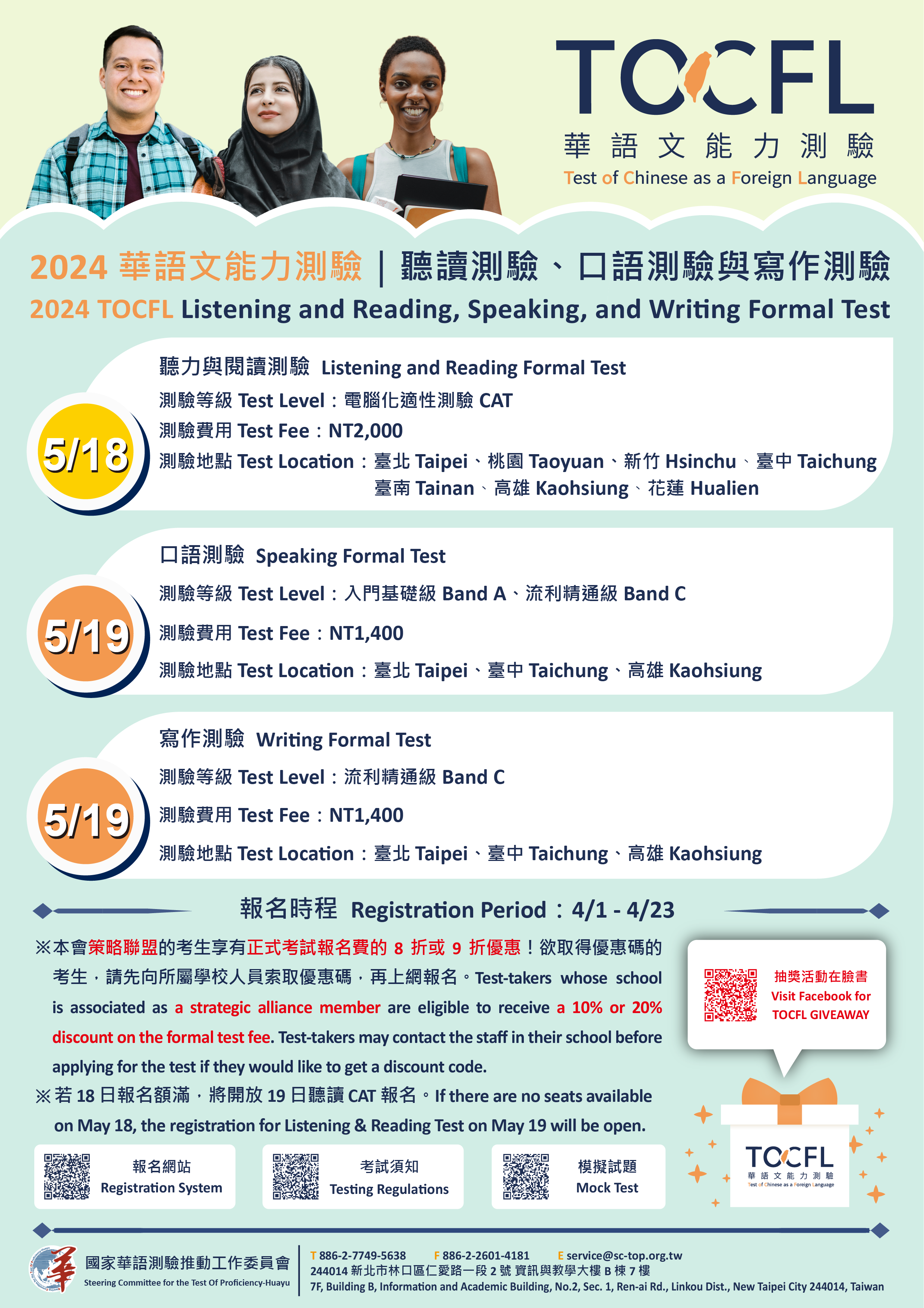 七、抽獎活動:凡報考口語或寫作測驗並完成繳費者,可參加華測FB粉絲專頁抽獎活動。詳情請見粉絲專頁貼文: https://www.facebook.com/SCTOP.TOCFL。