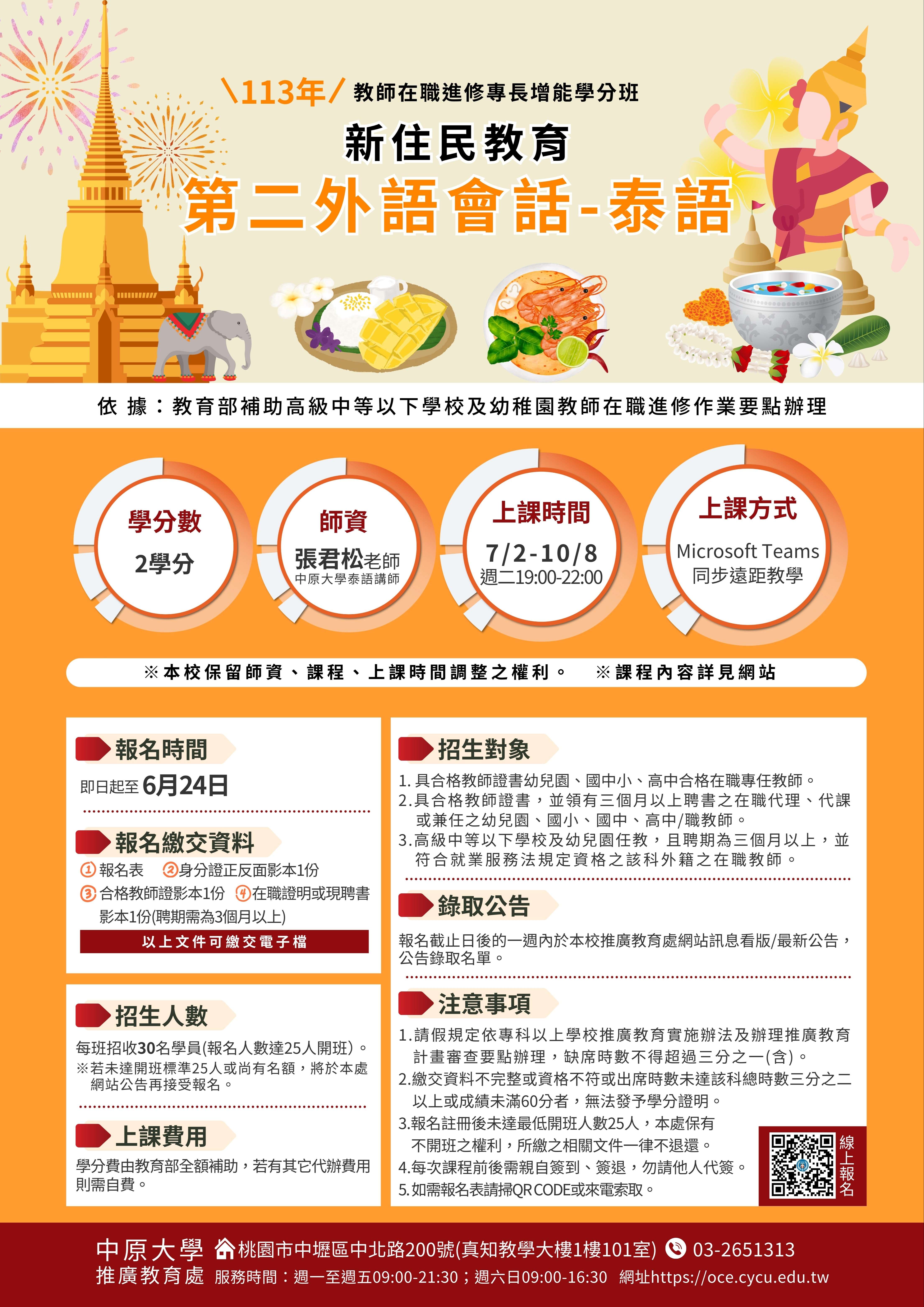 一、「新住民教育-第二外語會話(泰語)-同步遠距教學」課程之報名截止日為113年6月24日,限額30名。