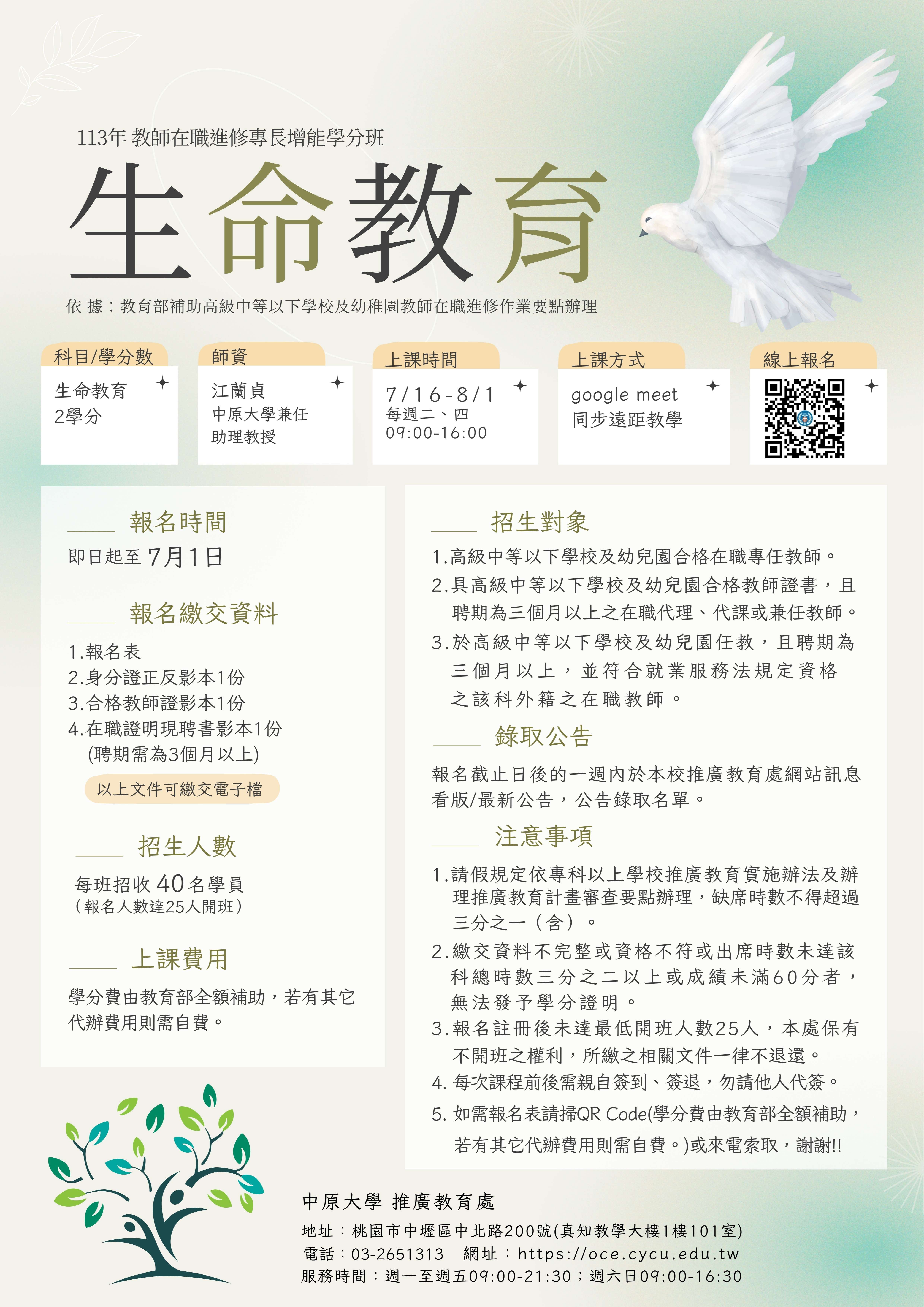 二、「生命教育-同步遠距教學」課程之報名截止日為113年7月1日,限額40名。