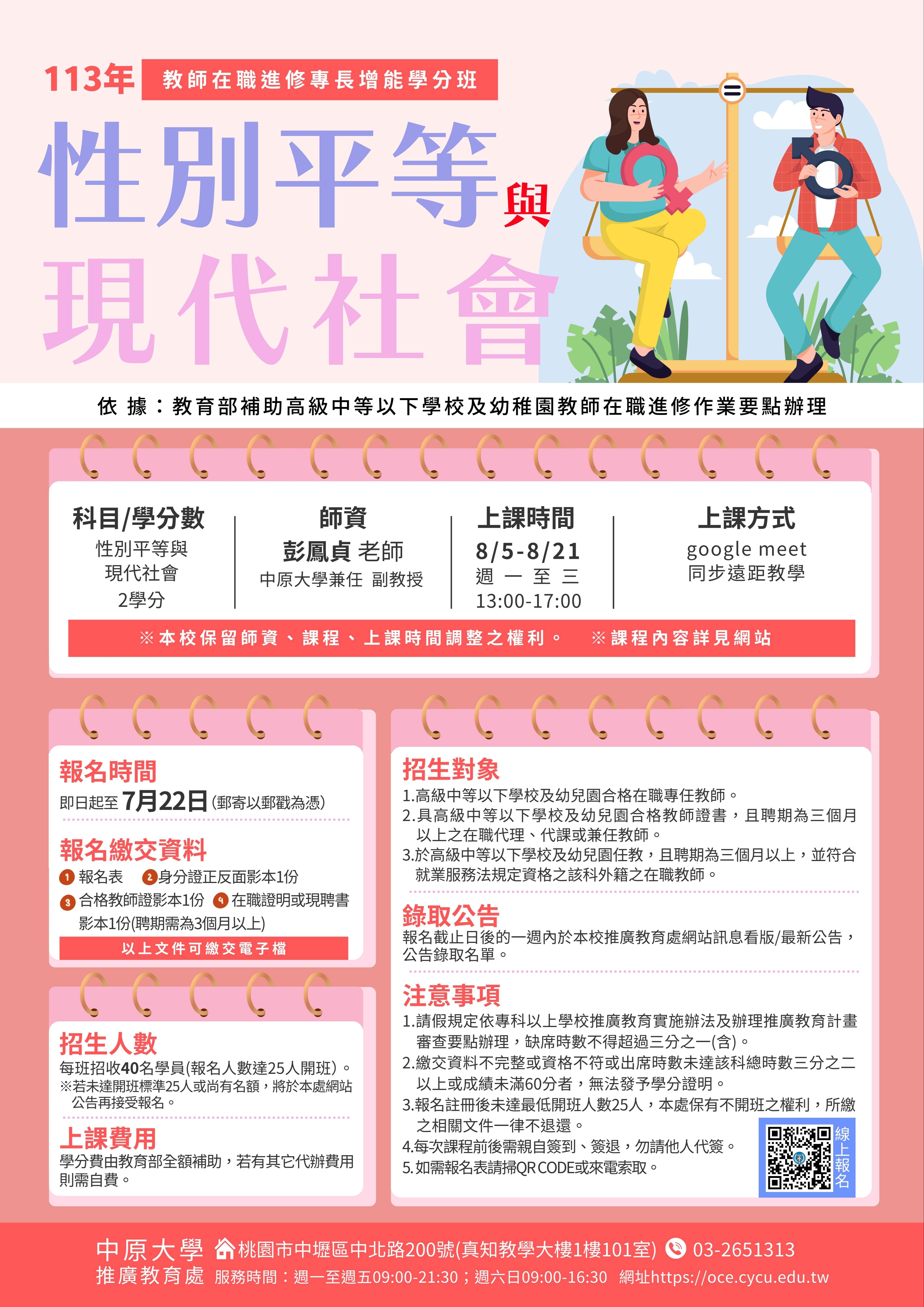 三、「性別平等與現代社會-同步遠距教學」課程之報名截止日為113年7月22日,限額40名。
