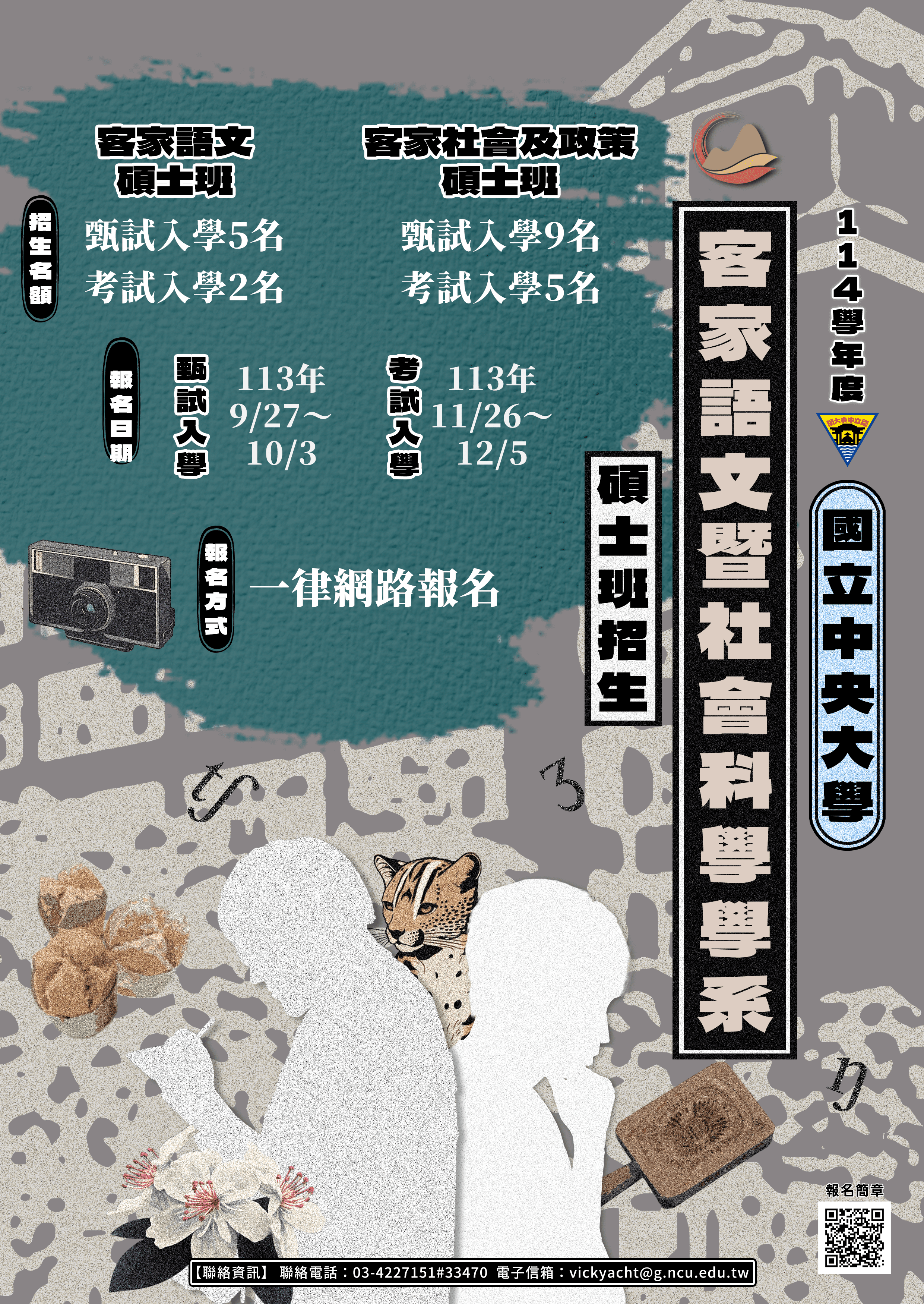 一、本校客家語文暨社會科學學系「客家語文碩士班」及「客家社會及政策碩士班」114學年度招生,分為甄試及考試入學兩種方式,並一律網路報名。