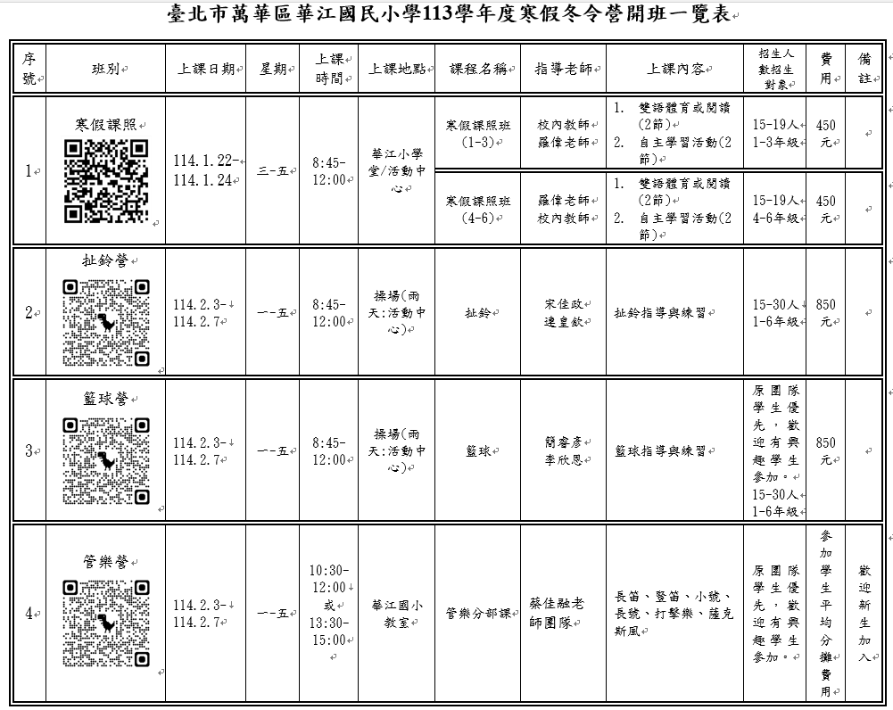 113學年度寒假「冬令營」報名作業即將開始,開課班別資料簡章如下,請家長撥空詳細閱讀內容,並請留意參加對象年級資格,同一時段僅能勾選1個班別,勿重複報名!感謝您的支持與配合。