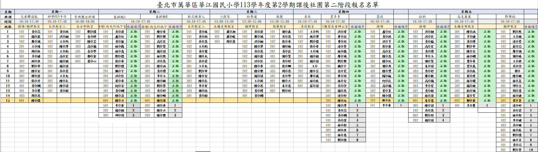 113學年度第2學期「課後社團」第1、2階段報名錄取名單如附檔,額滿社團由電腦隨機抽出名單與候補順序,之後若有名額釋出將依序以電話通知候補者。