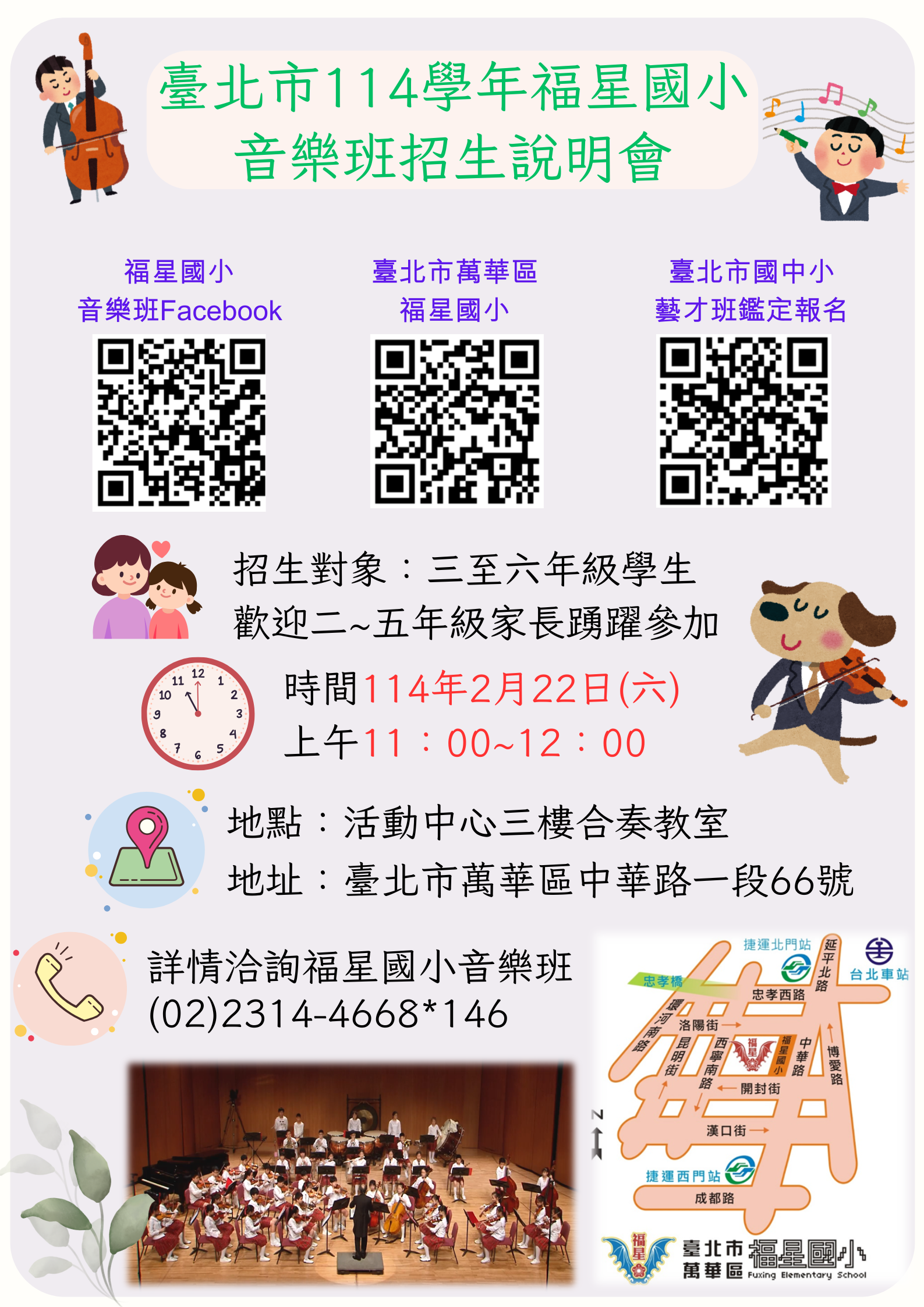 二、招生說明會資訊如下: (一)時間:114年2月22日星期六上午11:00。 (二)地點:福星國小學生活動中心三樓合奏教室。(臺北市萬 華區中華路一段66號,捷運北門1號出口站或西門町6號 出口) (三)活動內容:簡介本校藝術才能音樂班及114學年度入學考 試相關內容,並介紹音樂班教學環境與教育特色,以及 國中升學管道之最新資訊。