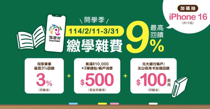 (二)活動內容:活動期間當月使用悠遊付每筆扣款享3%(限 量,每戶回饋上限100元)悠遊付回饋金,另累積消費新 臺幣(以下同)10,000元加3筆帳戶或錢包消費即回饋 500元指定通路現金回饋券,悠遊付綁定元大銀行帳戶或 玉山信用卡加碼回饋金(上限100元),活動期間每戶最 高回饋9%悠遊付回饋金(或回饋券)。