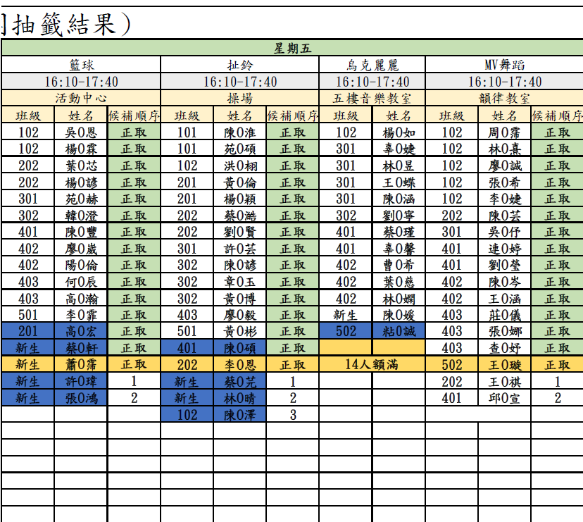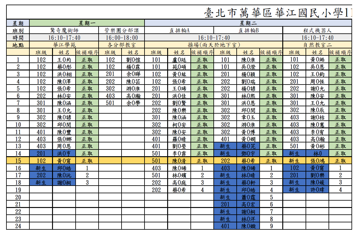 二、額滿社團如有取消報名者,將以電話依序通知候補學生家長。