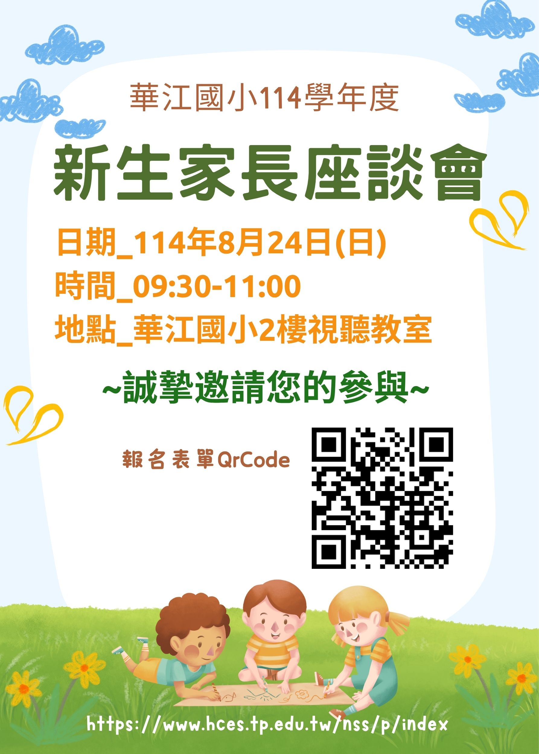 邀請您在114年8月24日(星期日)上午9:30~11:00,參加我們特別舉辦的新生家長座談會,由校長及各處室主任介紹處室業務及提醒小一新生入學該注意的地方,竭誠邀請您撥冗參與!