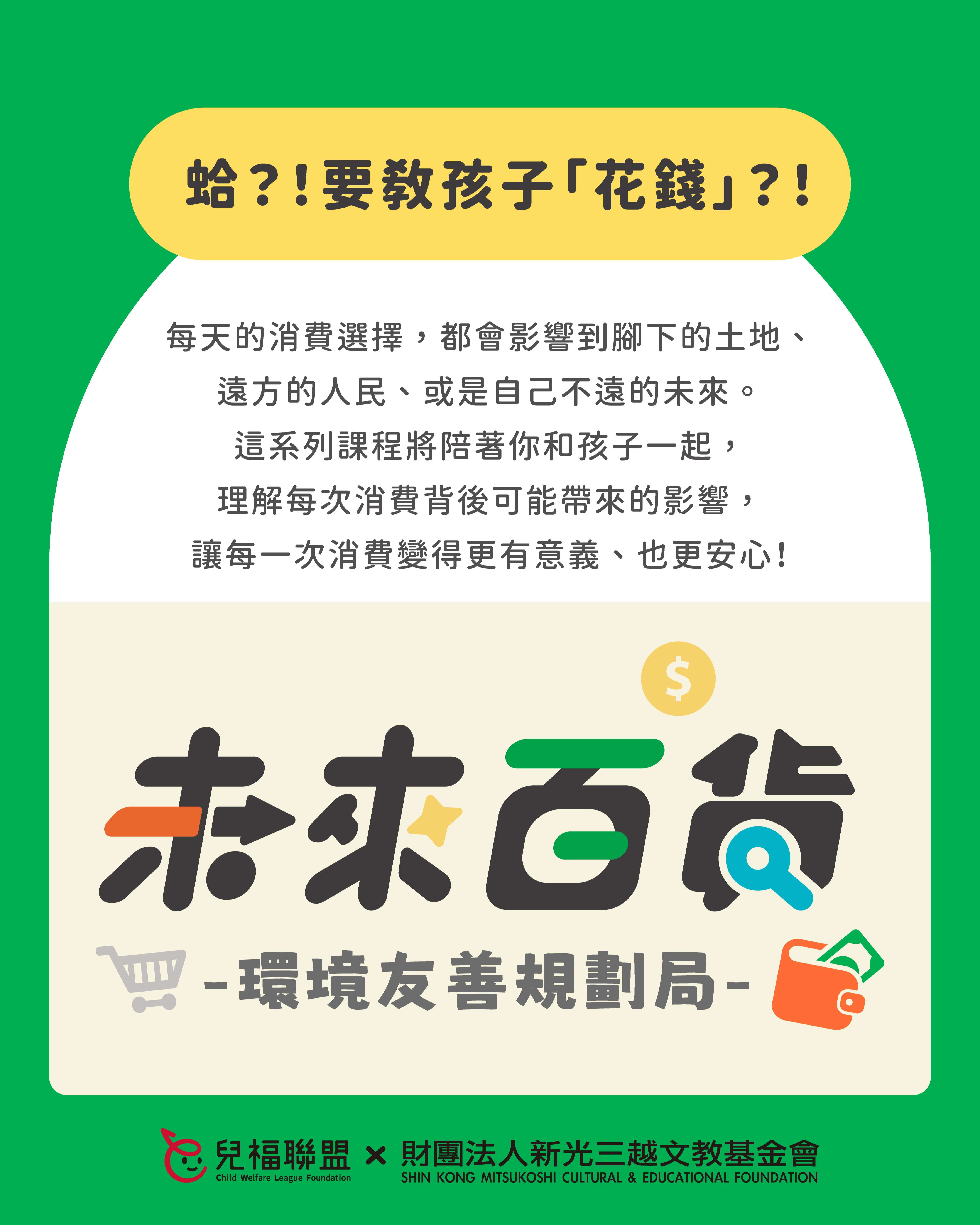 一、為培養學童面對未來社會的獨立思考、溝通表達、永續素養等能力,並促進親子共學機會,本會辦理「新人類時光機:未來百貨-環境友善規劃局」系列課程,透過貼近生活、以遊戲和體驗為主的學習設計,引導孩子理解責任消費、環境保護等永續議題,練習整理觀點並付諸行動,以家庭、自身的生活為起點,為社會帶來良善的改變!