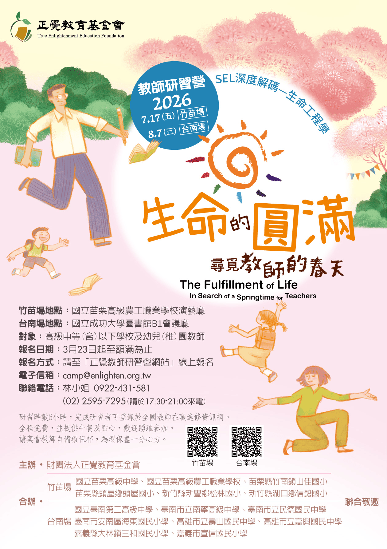 二、本基金會於2026年暑假期間舉辦竹苗、臺南兩場教師研習活動「生命的圓滿──尋覓教師的春天」如下: